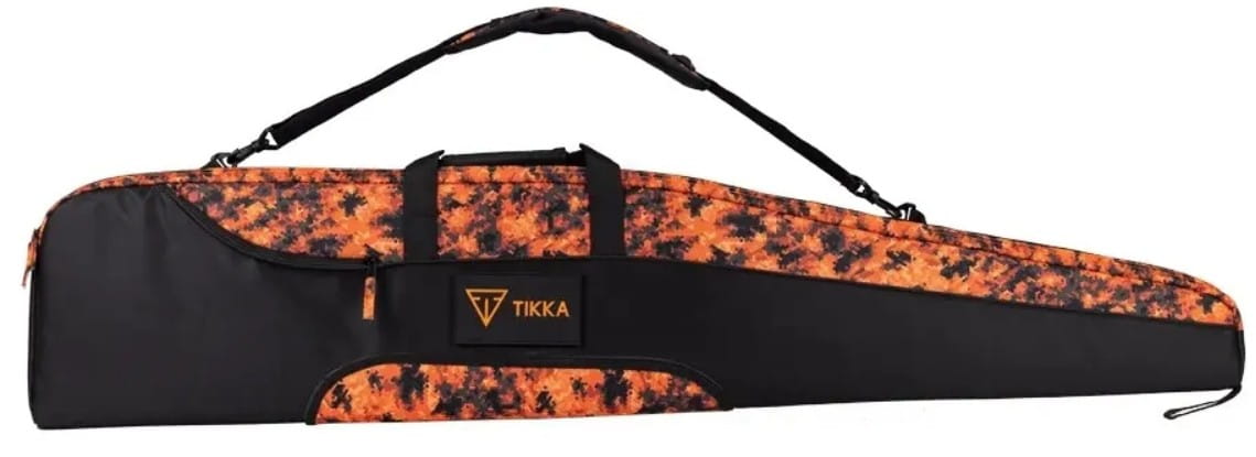 Torba na broń Sako/Tikka w pomarańczowym kamuflażu cyfrowym jest wyściełana i pasuje do karabinów o długości do 127 cm i szerokości 25 cm. Posiada odpinany pasek na ramię z wyściełaną częścią, uchwyt do noszenia oraz dużą zewnętrzną kieszeń zapinaną na zamek błyskawiczny.